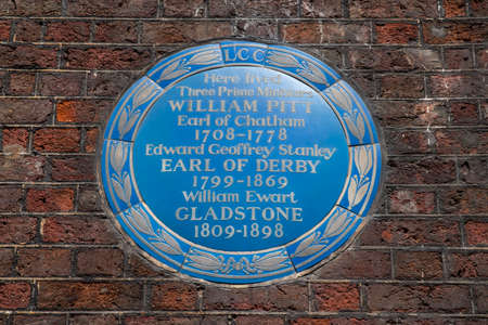 LONDON, UK - JUNE 14TH 2017: A blue plaque marking the location where three former Prime Ministers have lived in St. Jamess Square in London, UK, on 14th June 2017.