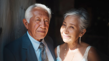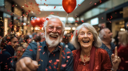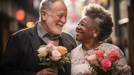 Elderly couple celebrates their wedding anniversary surrounded by flowers Generative AI
