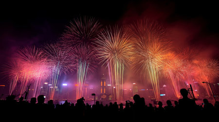 A stunning fireworks display lights up a vibrant city skyline at night, creating a festive atmosphere filled with color and excitement for onlookers.