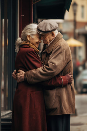 Elderly couple celebrating valentine's day, exchanging loving glances, holding red roses, with heart-shaped lights in the background