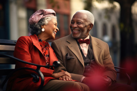 An elderly dark-skinned couple, a man and a woman, are hugging on a bench in the park. They enjoy communication. Date. Old African American lovers. Relationships in old age. Love and romance