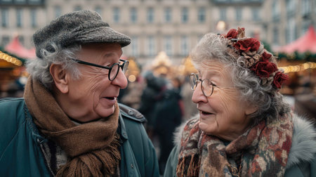 A cheerful elderly couple enjoys a light-hearted moment at a winter market, surrounded by festive decorations and joyful atmosphere, radiating warmth and love.