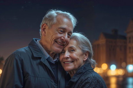 Happy pensioner couple of older people are smiling and hugging each other against night city background