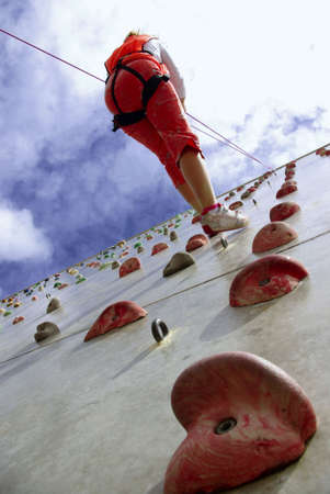Young girl climbing up secured with rope. Wall is a blue balloon with mounted steps