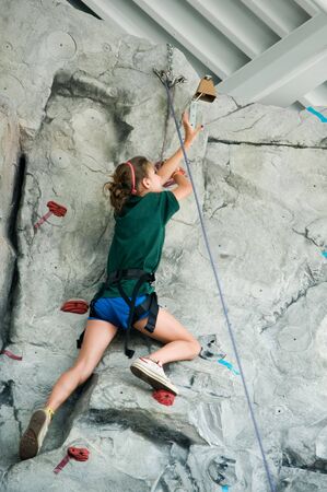 Girl wearing in safety equipment climbing on artificial boulders in gym. Girl inserting the rope in a quickdraw