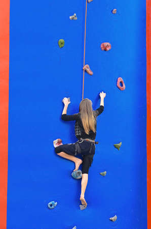 One cute teen girl practicing on the rock wall in climbing center. Concept of sportive lifestyle, activity, happy childhood
