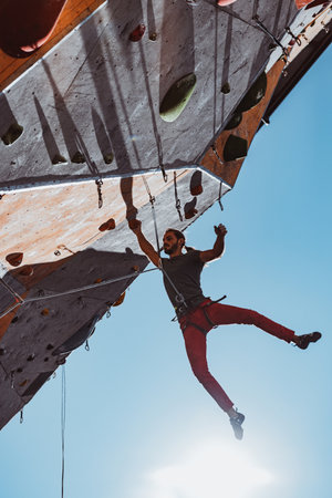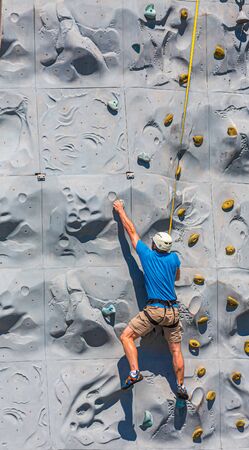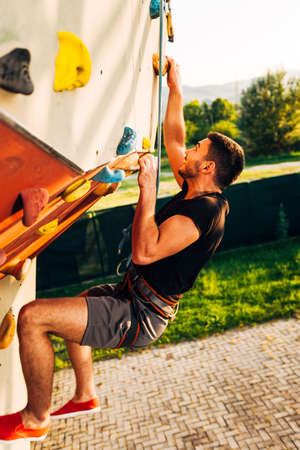 Young man professional rock climber practicing at training center in sunny day, outdoors. Concept of healthy lifestyle, activity