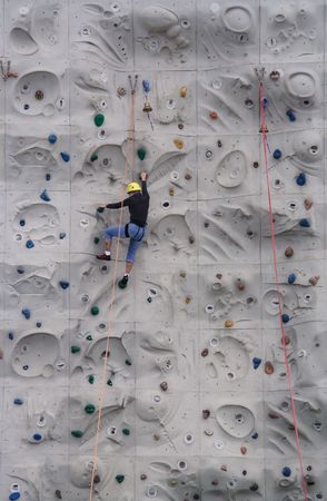 Sportsman climber moving up on steep rock, climbing on artificial wall indoors. Extreme sports and bouldering concept.