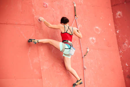 Young woman rock climber climbing on artificial rock wall in outside climbing gym. sports woman working out on extrime sport route. strength, conquering and training concept