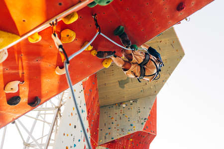 rock climber climbs the route. climbing wall in the city for extreme sports.