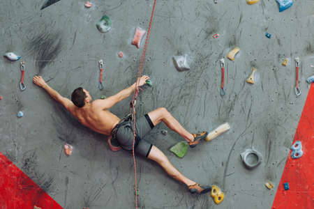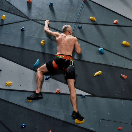 Middle aged shirtless man in safety equipment and harness training on the artificial climbing wall indoors