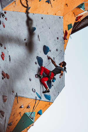 strong athletic african american man with alpine harness climbing up rock wall gripping on rocks