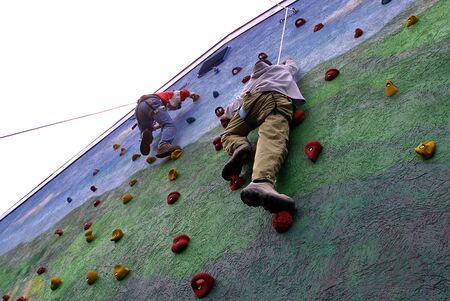 couple of athletes climber moving up on steep rock, climbing on artificial wall indoors. Extreme sports and bouldering concept.
