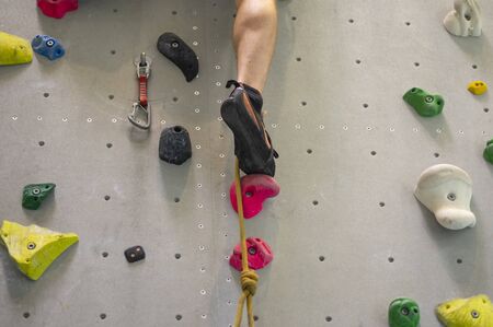 Low angle close up view of rock climber female foott on grey artificial climbing wall.