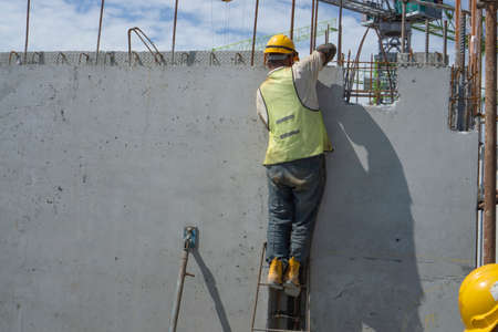 A man builder is installing precast concrete wall structure with steel bar on top floor of building, waring orange safety helmet and green vest , tower crane on background under clouldy sky