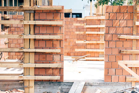 brick wall and pole house in residential building construction site