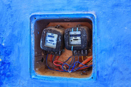 CHEFCHAOUEN, MOROCCO - MAY 29, 2017: Old electric meters on the blue wall in the historical part of Chefchaouen, Morocco.