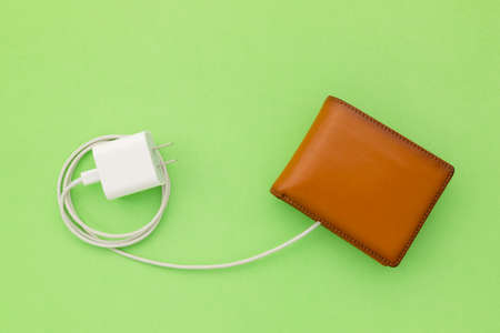 Charging the power to financial concept : Top view white charger cable connect to brown wallet on green background