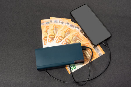 Smartphone, power bank and paper bills cash euros on gray background. Device purchase. Power-saving device and phone.