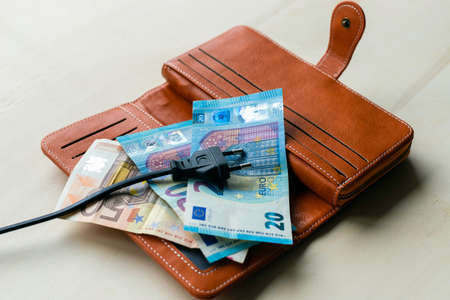 Woman hand puts electric power plugs in open wallet with Euro banknotes. Energy efficiency, power consumption, rising electricity price and expensive energy concept