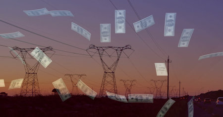 Falling dollar bills image over power lines at sunset. Finance, wealth, electricity, energy, transmission, economics