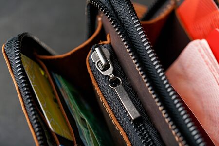 Moscow, Russia, January 17,2021 - Few credit cards (Visa, Mastercard and Mir) in the leather vintage wallet coin-box at wooden table, product concept shot.