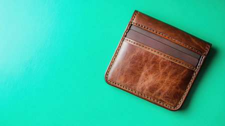This elegant brown leather wallet features a minimalist design, perfect for everyday use. Its vibrant green background highlights its stylish functionality and craftsmanship.