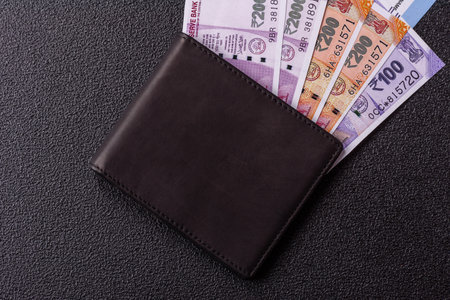 Indian five hundred (500) rupee cash note in brown color wallet leather purse on a wooden table. Business finance economy concept. High angel view with copy space room for text on left side of image.