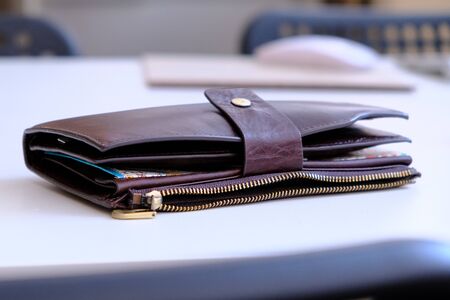closeup leather wallet on wood table