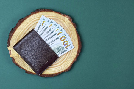 Fan of dollars in wallet. Studio photography of American national currency. Cash money currency of United States on green background. US Dollars 100 banknote. Close-up. Copy space. Top view.