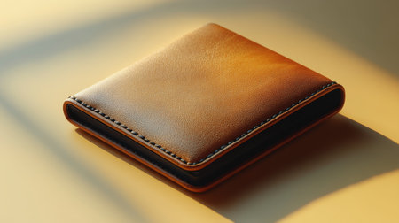 A timeless leather wallet rests on a sleek surface, illuminated by warm sunlight that highlights its aged patina and intricate stitching, evoking sophisticated craftsmans
