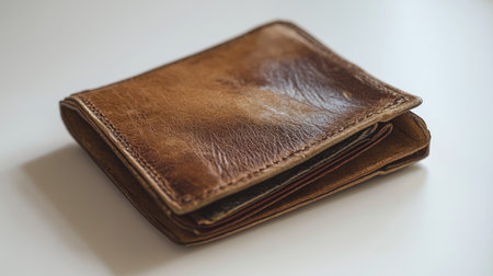 A vintage leather wallet captured on a glossy reflective surface, highlighting its craftsmanship and unique texture under soft natural light for a captivating aesthetic.