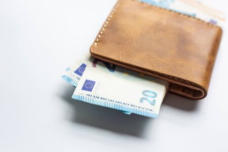Leather bifold wallet with euro money bill on white background