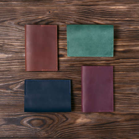 Four handmade leather passport covers on wooden textured background. Up to down view. Stock photo of luxury accessories.