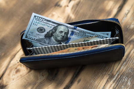 open women's wallet with dollars and hryvnia on a light beige background close-up