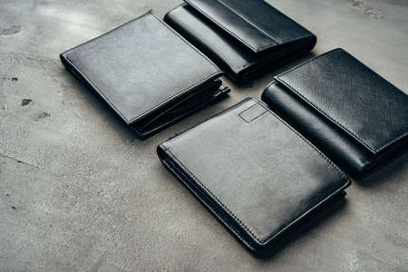 Male leather wallets on grey concrete background