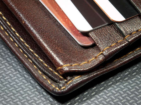 Detail of a leather wallet with credit cards.