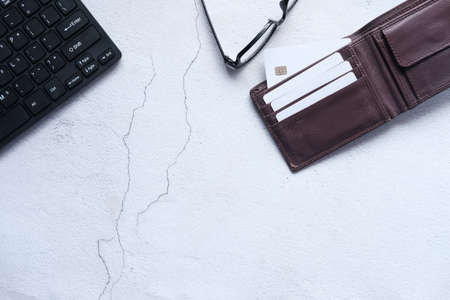 Glasses blackbook and wallet on desk of white table, Copy spcae left for your text
