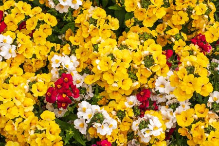 Floral background, top view. Various red and purple garden flowers. Natural banner, backdrop.
