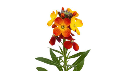 A single wallflower plant with multiple blooms in shades of orange, red, and yellow, isolated on a transparent background.
