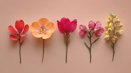A beautiful bouquet of colorful flowers in shades of pink, purple, and orange set against a soft beige background, perfect for various design and d