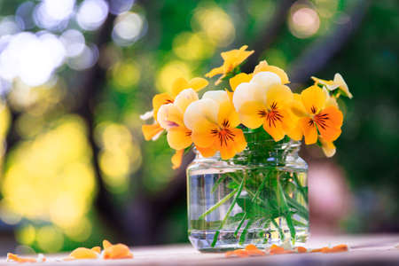 Bunch of flowers pansies in a jar of glass with green background outside.