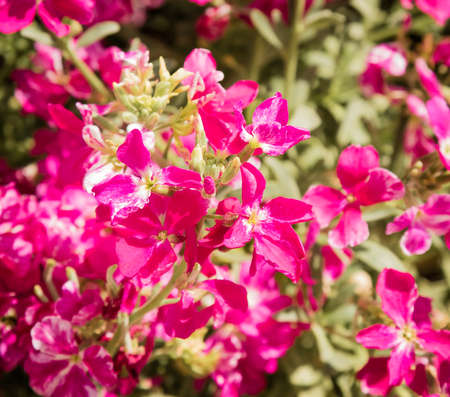 Close-up purple wallflower in garden. Colorful spring outdoor blossom.