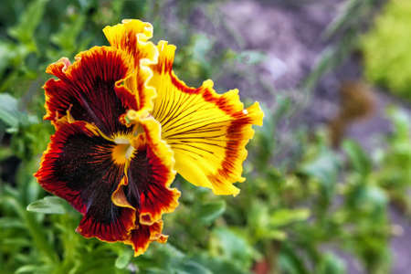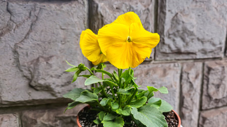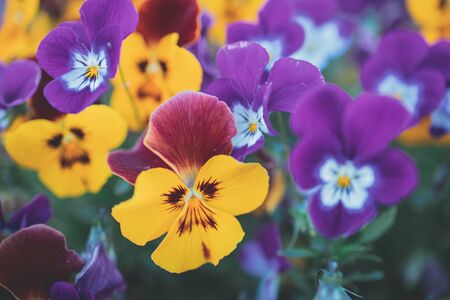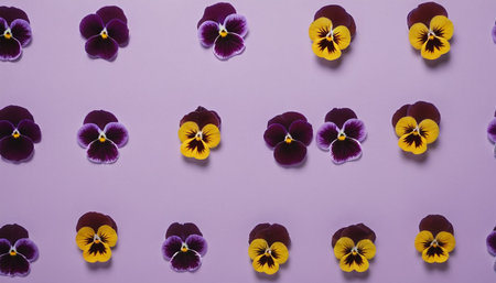 Close-up of vibrant pansies with purple and yellow petals in full bloom. A beautiful garden scene of floral beauty.