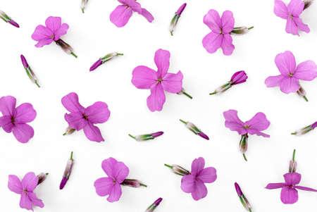 Beautiful cluster of white hesperis close-up in macro. White background of group of small flowers of nightviolet with copy space.
