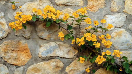 This image captures vibrant yellow bougainvillea blooms flourishing against a rustic stone wall, creating a stunning contrast of colors and textures.