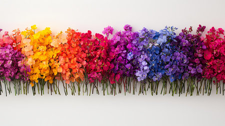 Rainbow-hued flowers arranged beautifully in a garden setting, with clear space for LGBTQ pride-themed designs and text.