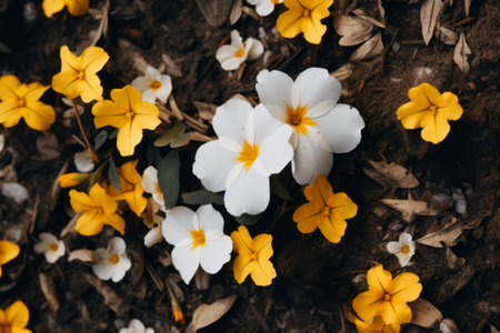 beautifully arranged collection of pressed yellow, purple, and white flowers and green leaves is displayed on a textured, aged paper background in Italy. High quality photo