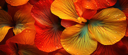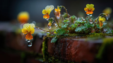 This macro photograph showcases delicate yellow and orange flowers adorned with water droplets. The image highlights the detailed textures of the petals and leaves, illuminated by natural light. This composition evokes a sense of freshness and natural beauty. Suitable for various editorial and commercial applications.