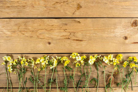 Flowers composition, bright yellow spring flowers on rustic wooden table, top view, place for text, copy space